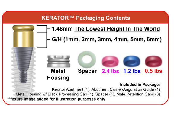 Each KERATOR Abutment comes with a carrier and complete Male Processing Kit (Metal Housing w/ Black Processing Cap, a Disposable Spacer, 3 Retention Caps). There is no need to order those separately or stock unnecessary extra parts sold only in bundles.